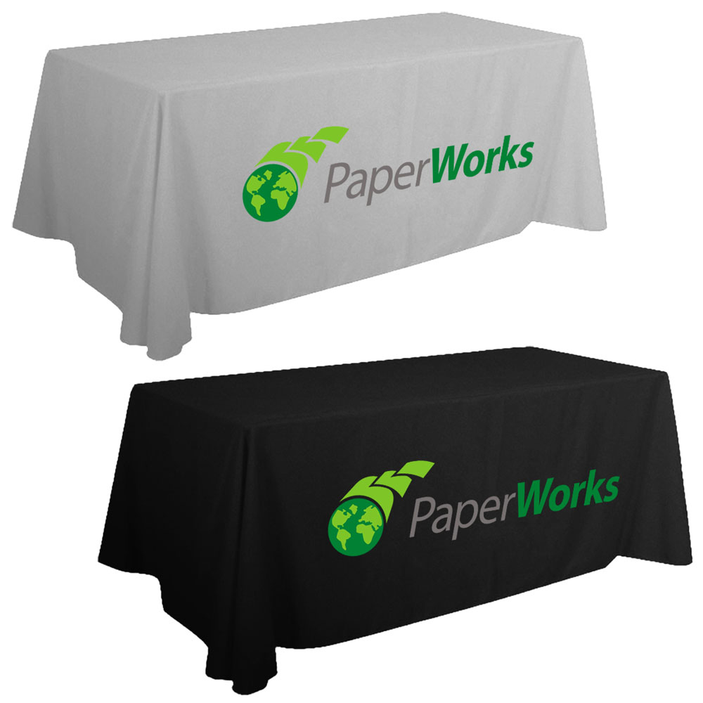 Our 4-sided non-fitted table cover with a full back is crafted from eco-friendly 6oz 300D polyester, featuring durable double-edge stitching. The white cloth is adorned with vibrant full-color digital printing, and it comes with a clear PVC carry bag for easy transport.