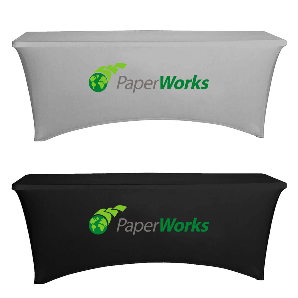 Our 7oz 300D Polyester Elastic Stretch Table Cover, crafted for both indoor and outdoor use, features a white material with full-color dye sublimation printing. It's wrinkle-resistant and machine washable, with double-edge stitching for durability. The cover comes with a clear PVC zippered carry bag, merging functionality with convenience.